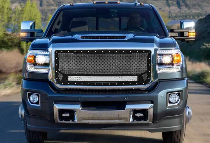 Tackle tough jobs and dark roads with the Overkill Fab Grille 4, specifically designed for the 2015-2019 GMC Sierra 2500 and 3500 heavy-duty trucks. This full center grille insert features a seamlessly integrated 30" LED light bar, providing powerful illumination and a rugged, custom aesthetic.